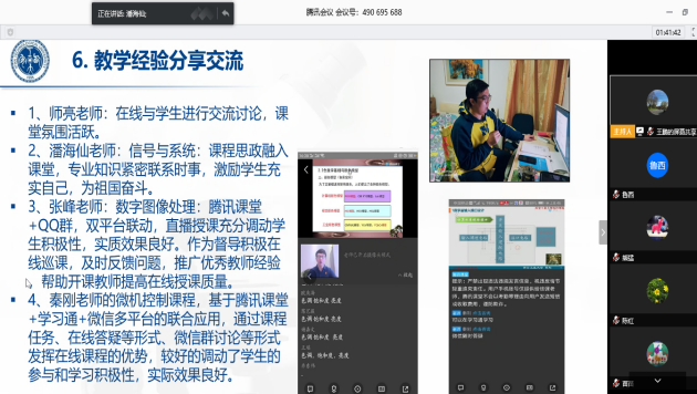 师亮老师重点介绍了录制慕课视频以及选择平台的经验,推荐使用主流教学软件和平台工具,保证已有教学资源的完整性。潘海仙老师将疫情期间“云监工”“远程会诊”等元素与专业课程知识紧密结合,激发学生民族自豪感;她建议大家在授课中融入课程思政,将德育与智育相结合,引导学生为国家富强和民族振兴做出贡献。张峰老师强调了课程教学设计和课堂师生互动的重要性,分享了授课过程中好的经验,极大地调动学生学习的主动性和积极性。秦刚老师作为校级咨询督导,分享了自己巡课后的体会,他提出,在线教学是开放的教学,各位老师在授课中要注意着装、言语得体,注意上课细节的把握,提高课程展示能力。