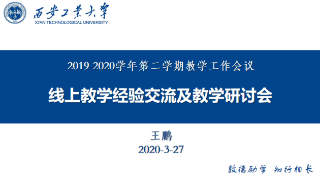 总体到课率和各专业的开课率统计,并动员未开课教师积极开设线上课程,确保教学任务顺利完成。其次汇报了2020届毕业生线上开题答辩情况,并对开题答辩中和学生调查问卷中反映出的问题进行了梳理并提出了具体措施,督促教师对学生论文进行全过程线上指导,及时了解学生工作进度,提出评价和指导意见,确保质量。接着对督导组线上巡课过程中发现的问题进行了反馈,并提出了改进建议。希望授课教师能做好教学设计,加强师生互动,以学生为中心,提高授课质量和效果,确保线上教学与线下教学实质等效。最后,邀请师亮、潘海仙、张峰、秦刚4位优秀教师进行教学经验分享和交流。