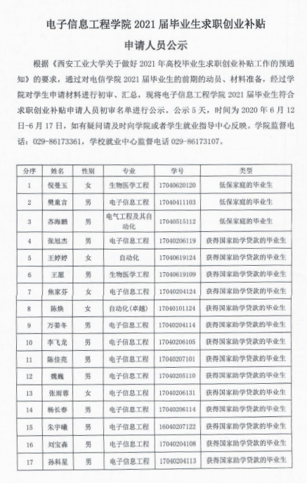 成人导航 2021届毕业生求职创业补贴申请人员初审名单在2020年6月12日-6月17日进行了线下公示,现将名单上传,进行线上公示公示5天,时间为2020年6月18日-6月月23日,如有疑问请及时向成人导航 或者学生就业指导中心反映。成人导航 监督电话:02986173361,成人导航就业中心监督电话:02986173107。