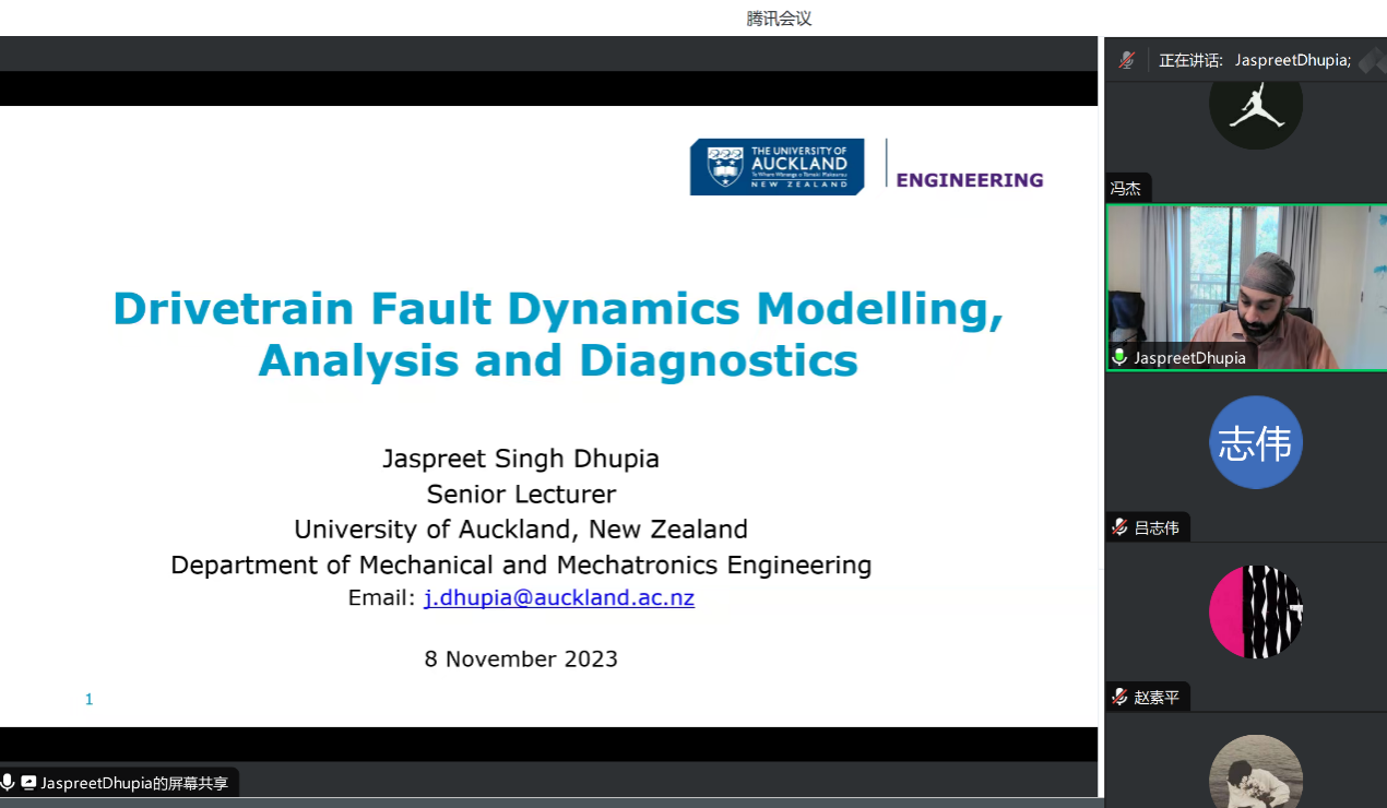邀请新西兰奥克兰大学高级讲师Jaspreet S. Dhupia博士做了题为“传动系故障动力学建模、分析与诊断”的报告。