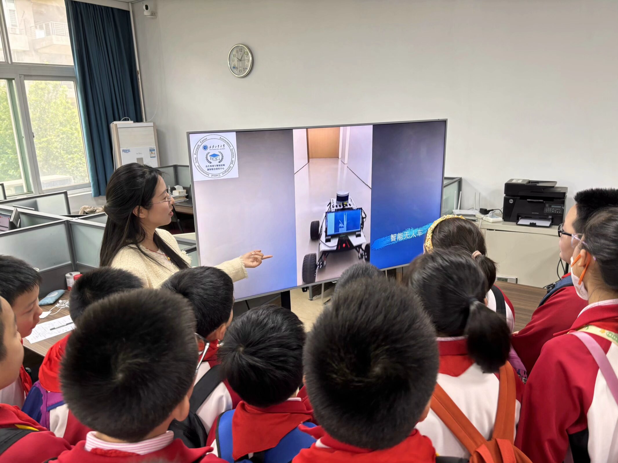 随后,小朋友们怀着好奇的心情参观了自主系统与智能控制实验室。在这里,他们得以近距离地观察无人车、无人机以及机械臂的构造。实验室的研究生热情地为他们讲解了机器人自主建图、路径规划的基本原理,用通俗易懂的语言,将复杂的科学概念变得生动有趣。