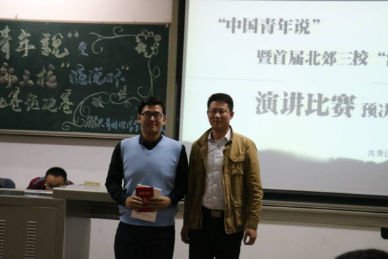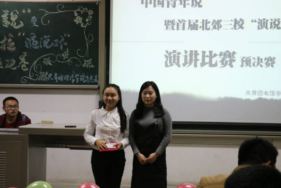 晚上6时许,“中国青年说”首届北郊三校“演说杯”演讲比赛预决赛在一段酷炫的开场视频中正式开始。接着,两位主持人为大家介绍到场嘉宾以及九位选手播放选手的VCR。随着赛程的进行,选手们一个接一个的展精彩的演讲。第一轮演讲文稿由选手自己准备,所有的选手都积极的展现自我,自信沉着,不负众望,凭借流利的口才、自信的姿态和自然丰富的肢体语言展示了当代青年大学生的风采,赢得了评委和同学们阵阵掌声。其间伴着文艺部的同学为我们带来美妙的歌曲,使会场气氛更加热烈。第一轮演讲结束后,团委副书记张国豪进行总结。在文艺的同学优美的歌声过后,比赛继续进行第二轮。第二轮演讲是选手在第一轮自我演讲结束后,自己抽取即兴演讲主题,每位选手通过冷静的分析、镇定的思考加上严谨的语言,为我们带来了又一场视觉与听觉的盛宴。最后,由电信成人导航 团委副书记夏开成老师进行总结,对同学们的表现进行点评。在欢跃的音乐中,主持人宣布本次比赛获奖名单,由嘉宾授予选手证书并合影留念,比赛于8时30分结束。