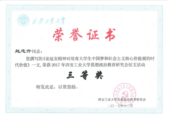 在此次年会中获得集体奖一项,即2017年度宣传工作“先进集体”;个人奖二项,分别为:张鹏荣获2017年度宣传工作“先进个人”,赵志升荣获2017年思想政治教育研究会征文活动三等奖。
